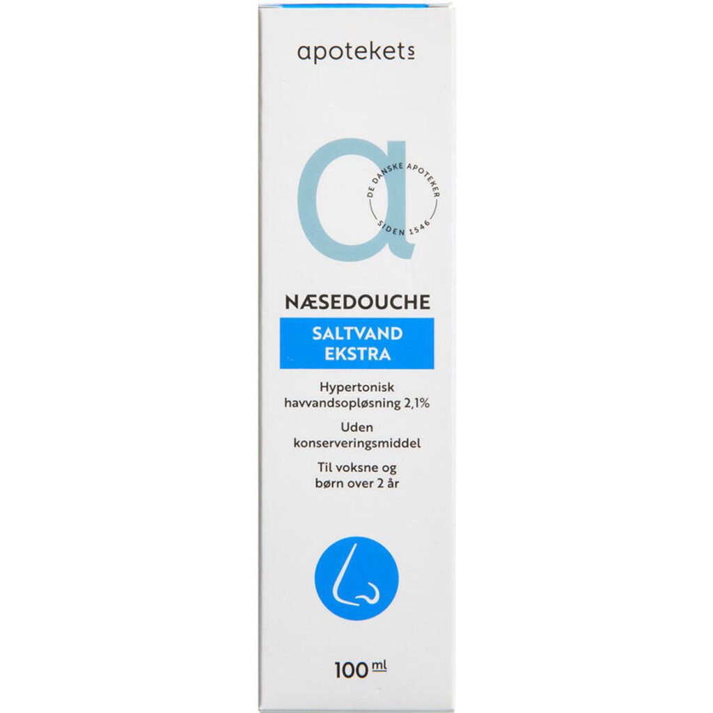 Apotekets Næsedouche Saltvand indeholder hypertonisk havvand, der hjælper til at reducere hævet næseslimhinde og lindrer tilstoppet næse via osmose. Skyller næsen for partikler, mikroorganismer, pollen og skorper og fortynder samtidig sekretet i næsen. Anvendes ved forkølelse, bihulebetændelse, høfeber og allergi.
