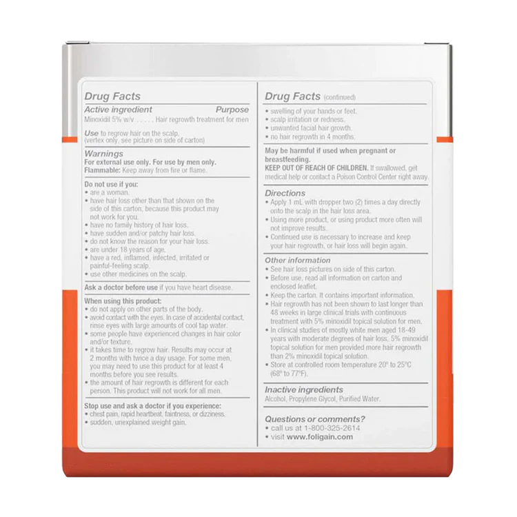 FOLIGAIN Minoxidil 5% til mænd er designet til mænd, der oplever arveligt hårtab. Den aktive ingrediens minoxidil 5% arbejder direkte i hovedbunden for at stimulere hårsækkene og fremme sund hårvækst.